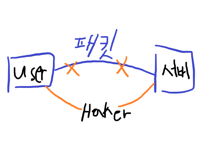 데이터의 집합을 주고 받고 해커가 그 사이에 패킷을 NTR해 간다고 생각하면 된다.