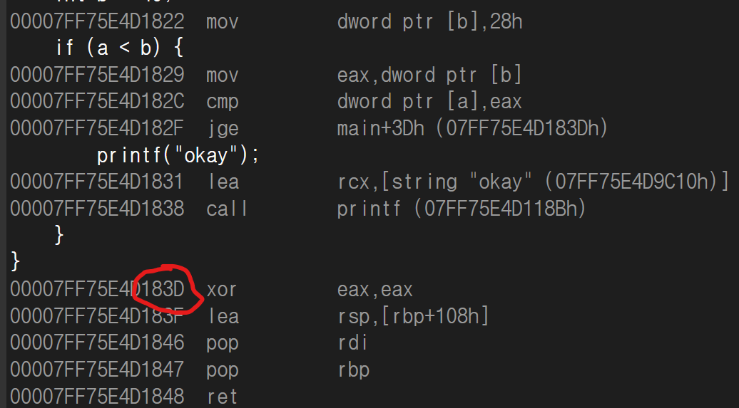 이제 여기서 부턴 if문을 어셈블리어로 변환한 것이다 먼저 mov 명령어로 eax변수에 b의 값을 담고