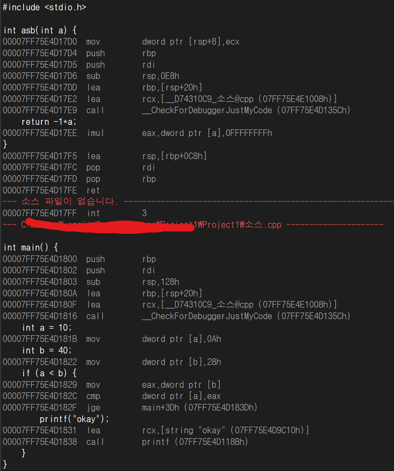 이 비주얼 스튜디오에서 지원하는 어셈블리어는 가독성을 위해 변수 구별을 해주는 것 같다 다른 칼리 리눅스에서는 주소로 각각 구별한다