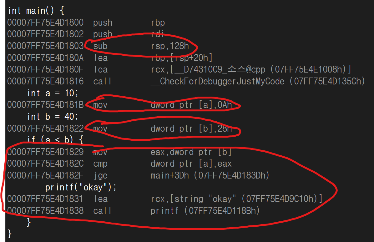printf문을 실행하는데 lea로 rcx에 "okay"라는 자료의 주소를 담아 call이라는 함수호출 명령어로 출력한다