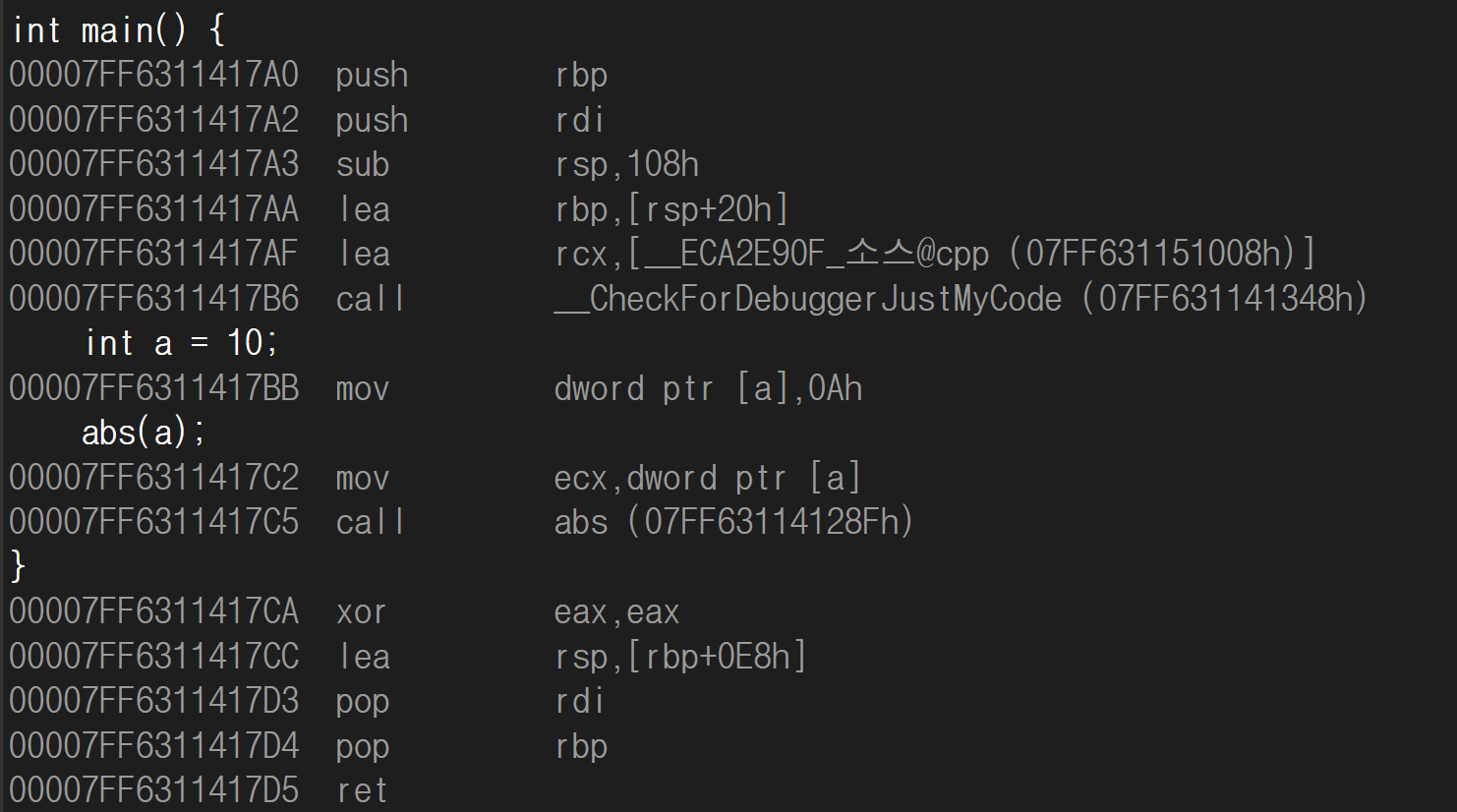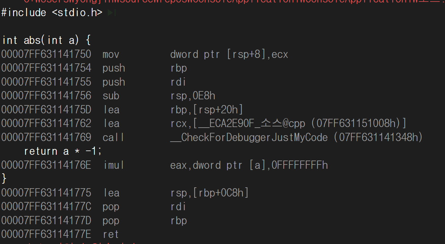 그리고 call라는 명령어로 abs라는 함수가 실행된다