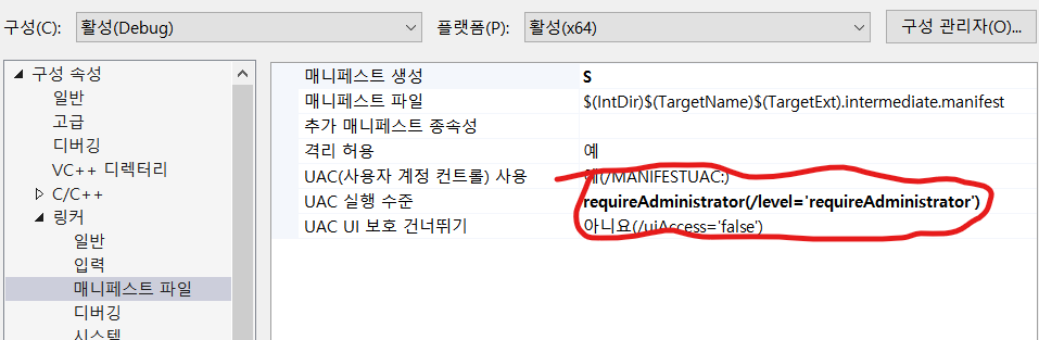 프로젝트>속성>링커>매니페스트 파일