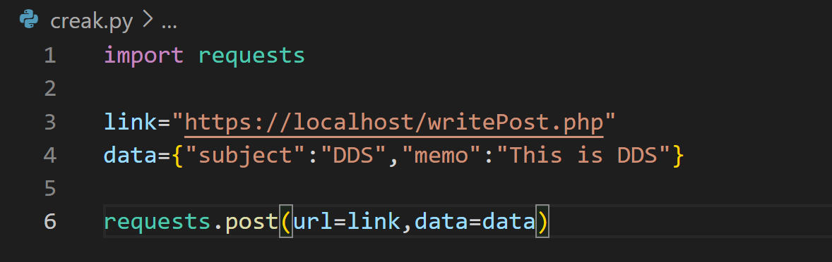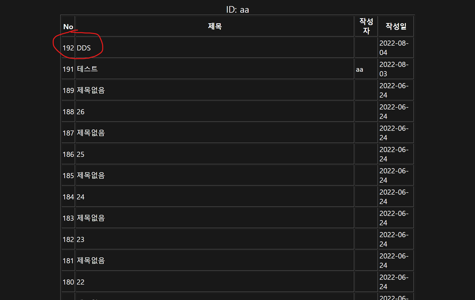 subject의 키인 DDS라는 제목과 함께 게시물이 작성되었다 참고로 위 코드의 data변수 딕셔너리의 값을 어떻게 알아 냈냐면 내가 공유한 코드에서도 발견할 수 있었지만 추후 알게 될 블라인드 SQL 인젝션으로도 알 수 있다