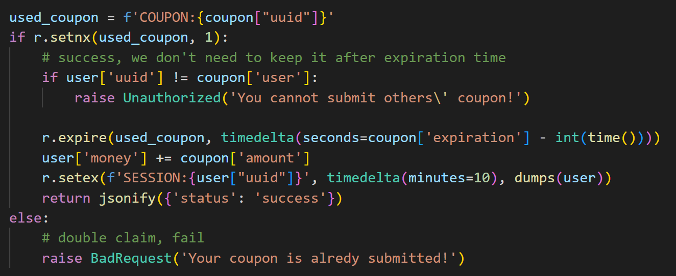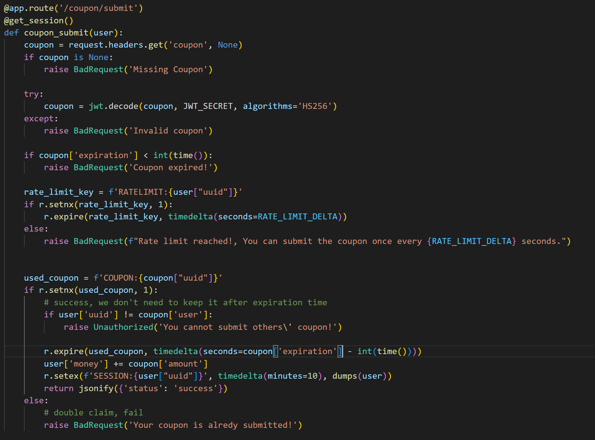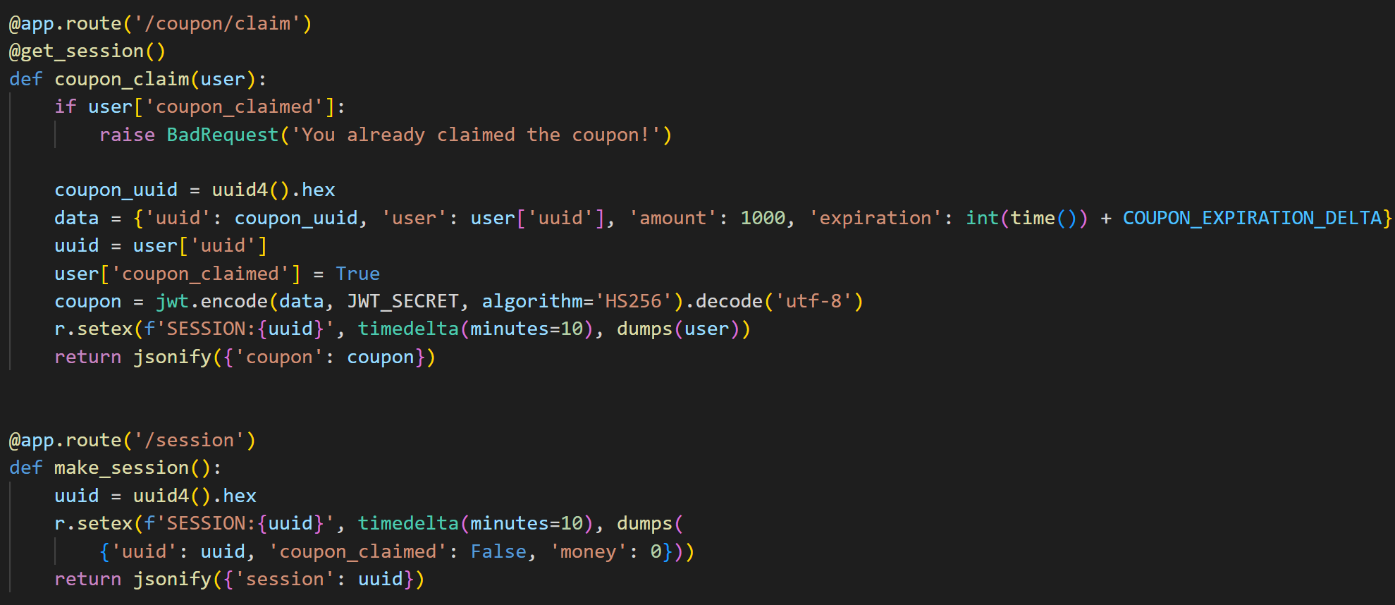 세션을 받아 그 세션으로 유저 정보를 갖고 와 쿠폰을 발급 받고 쿠폰을 사용하여, 자동으로 플래그를 구입하는 코드다.