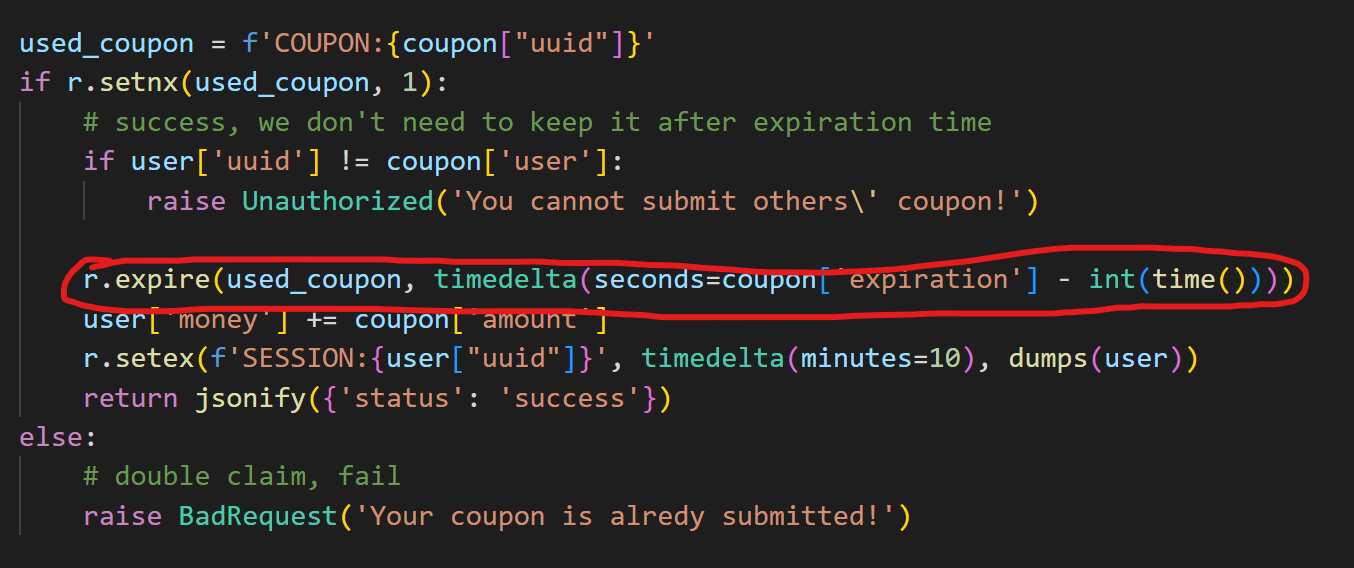 쿠폰을 사용할 때 실행되는 코드로 이 빨간 부분은 쿠폰의 세션을 (쿠폰 유효 시간-현재 시간)후 삭제를 하도록 되어 있다