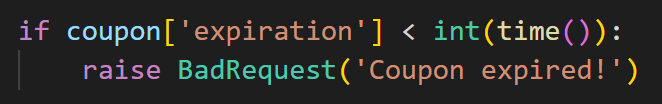 이 쿠폰은 발급 시간+45초와 현재 시간을 비교하여 시간 초과를 계산 하는 코드인데 int(time())의 함수가 문제다