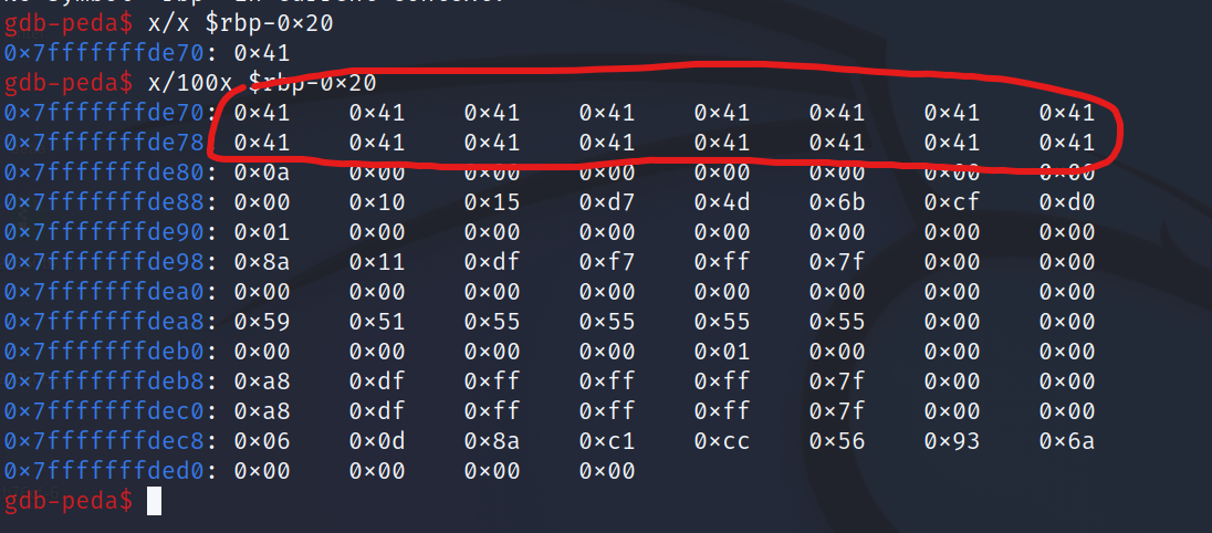 이 0x41은 우리가 입력한 A이며 256 끝자락의 16개의 문자만 보여주고 있는 상태다