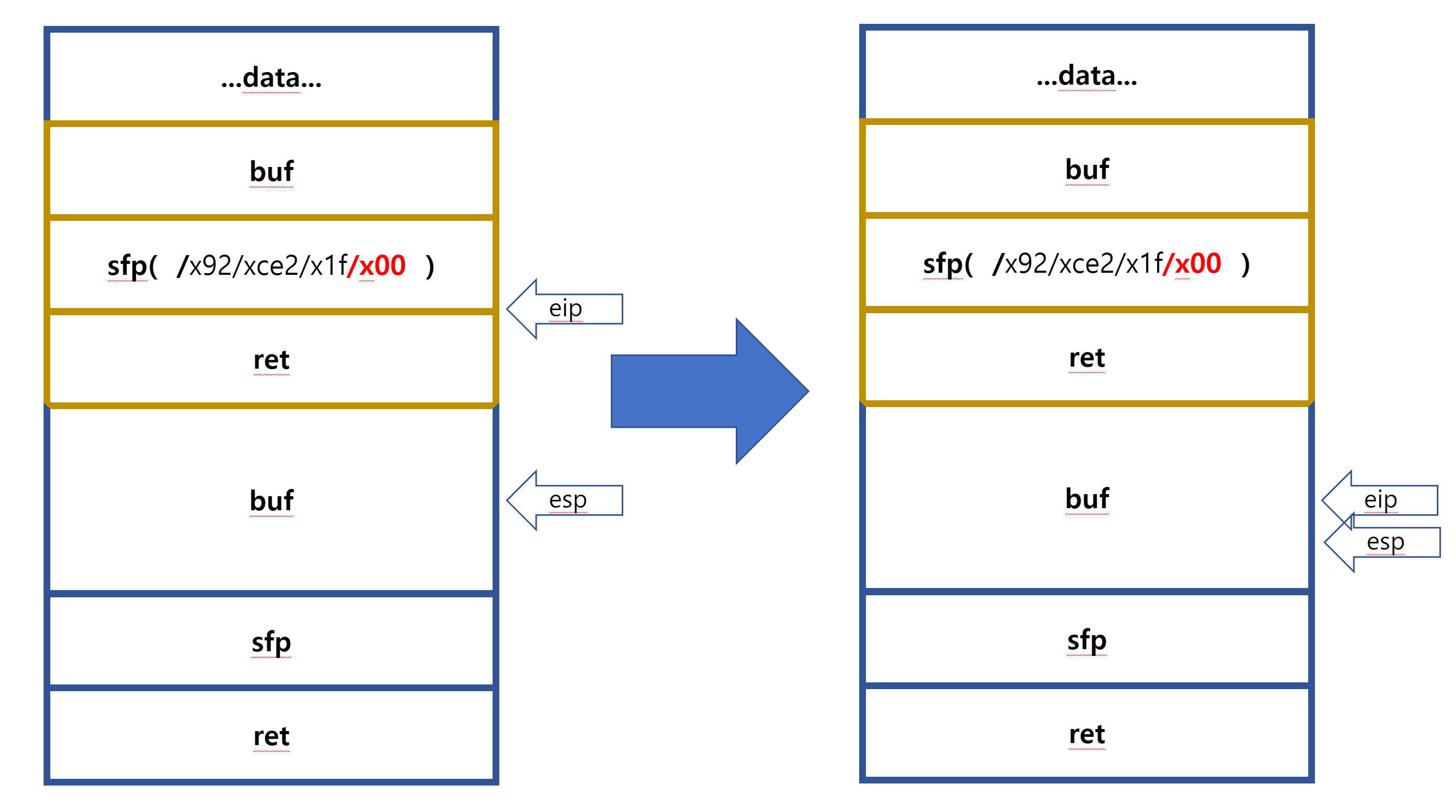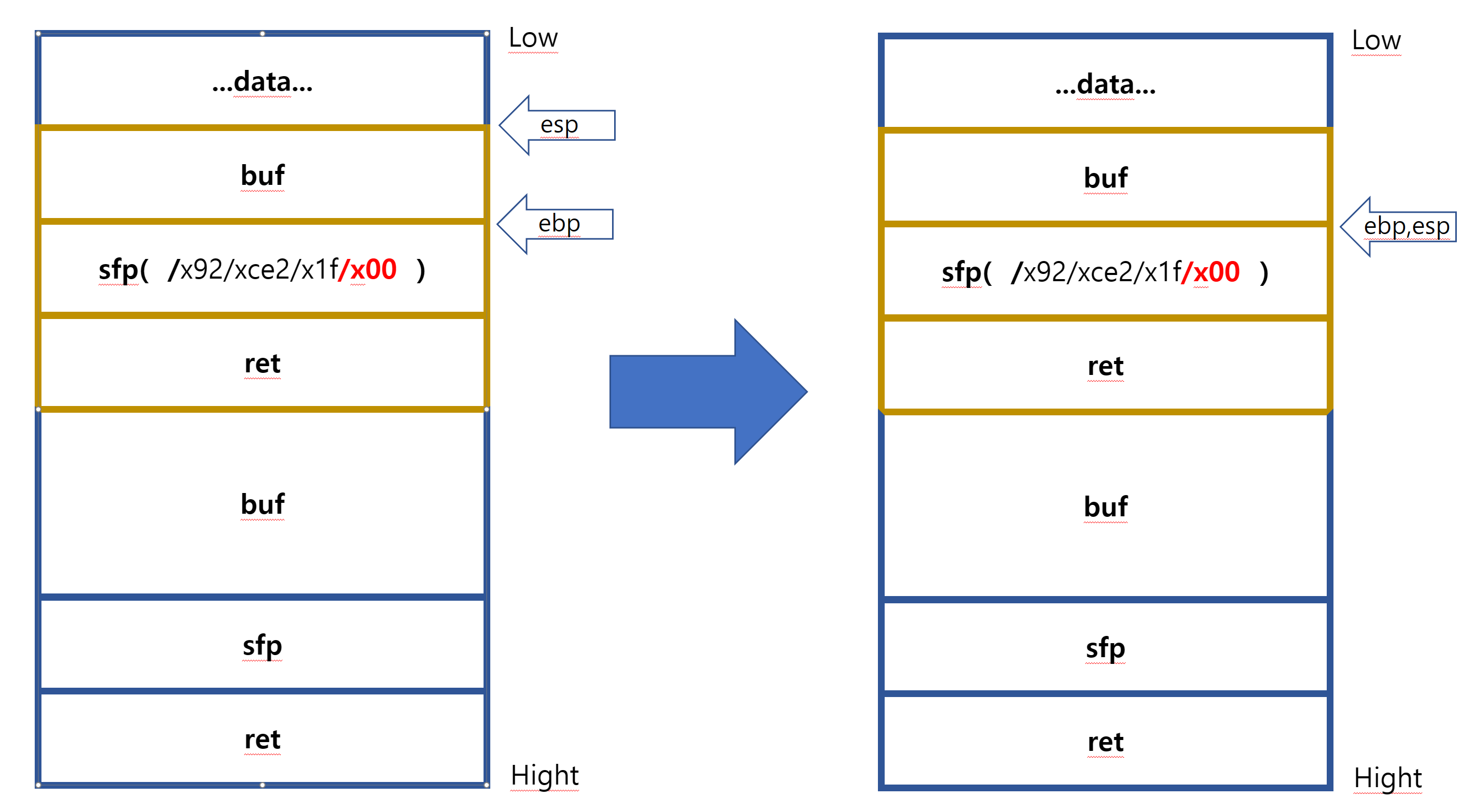 여기서 sfp의 주소는 임의로 정한다 그리고 감염된 1byte는 /x00로 간주하여 진행한다 먼저 mov esp, ebp를 통해 ebp가 가르치는 위치를 같게 만든다