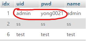 ID가 admin 뿐인 데이터를 가져와 보여 주게 된 것이다