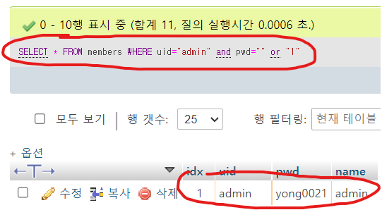 이렇게 SQL의 구문을 만족 시키기만 한다면 방금 보여준 예시와 달라도 어떤 패스워드에 값을 넣든 로그인이 가능하다