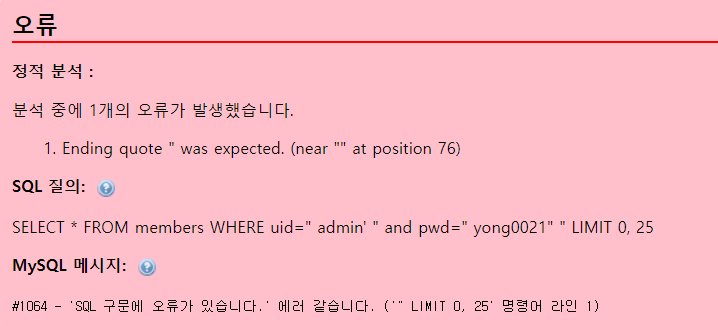 SELECT uid,pwd FROM members WHERE uid="admin" and pwd="yong0021"