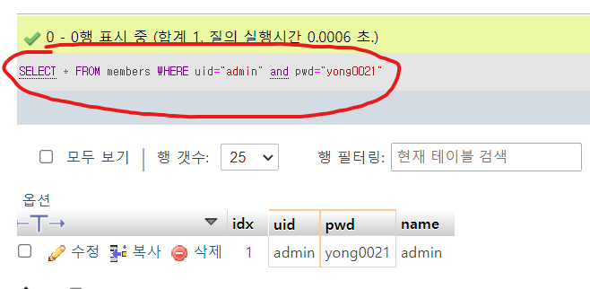 이 구문을 실행 할 시에 아래에 WHERE 조건문에 알맞는 데이터만 나왔다 이 데이터가 없다면 로그인은 실패한 것