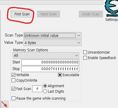 Then, select 'Unknown initail value' in 'Scan Type'. And click on the 'First Scan' button.