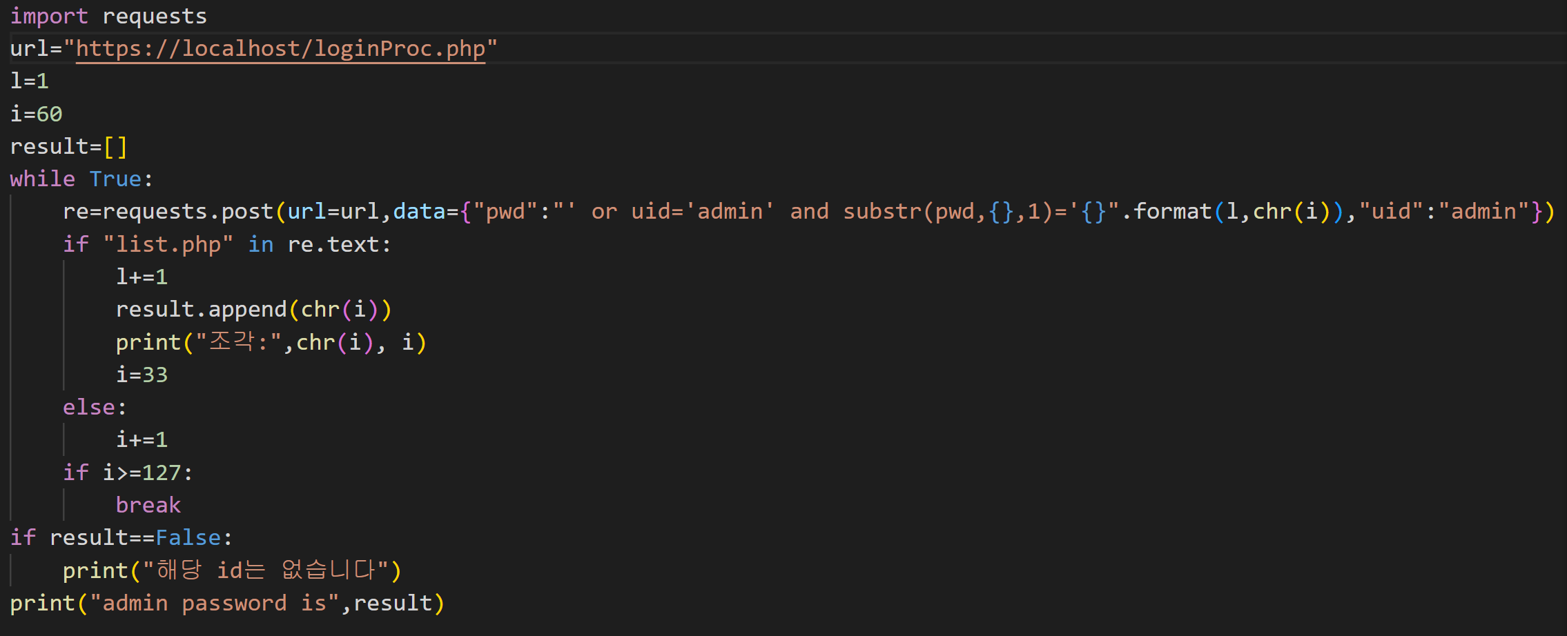 입력 값(" or uid="admin" and substr(upw, 1, 1)="A)이 꽤 낯설다